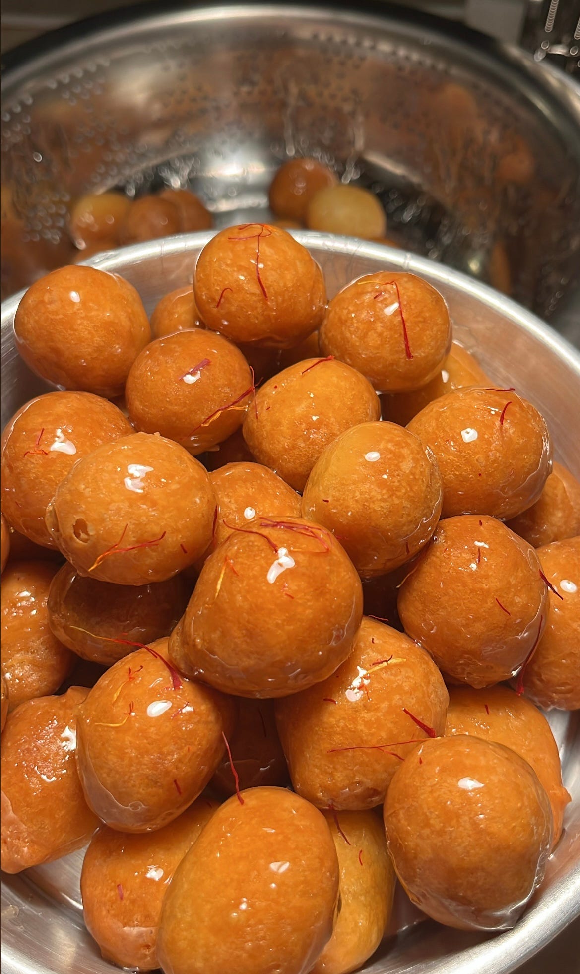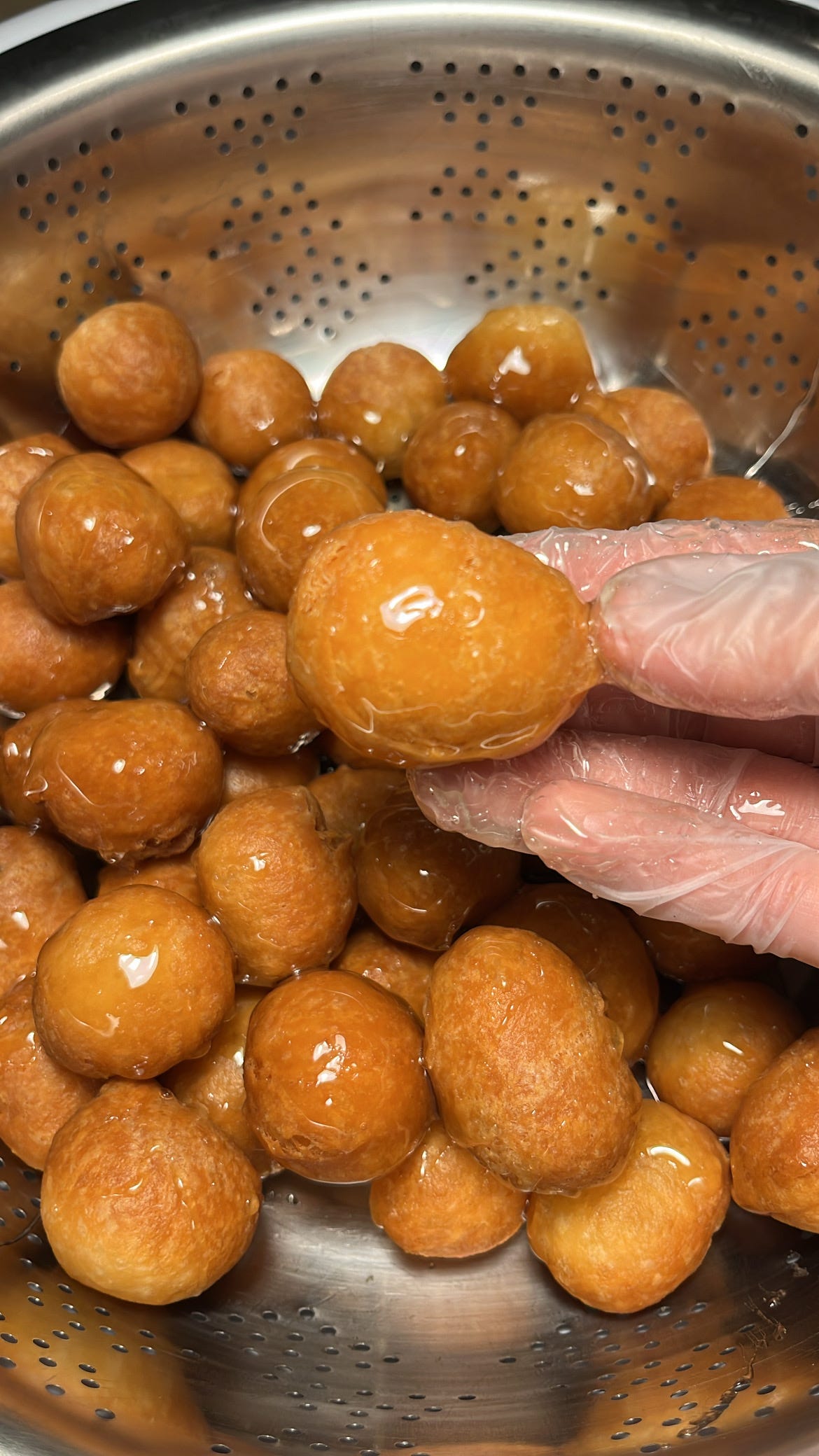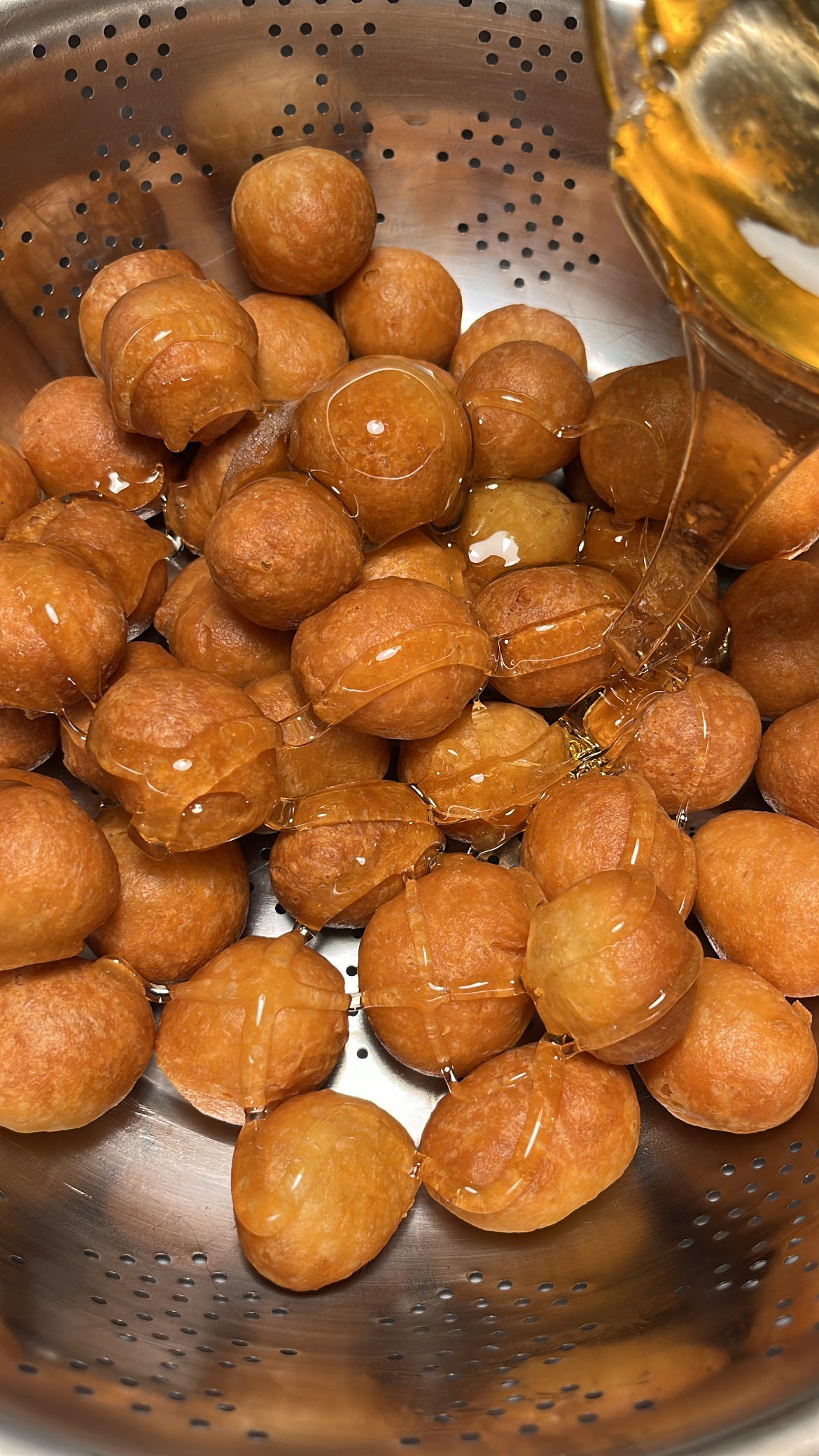 تسكب الشيرة الثقيلة على حبات اللقيمات وتقلب ولاتغطى بل تترك في وعاء يفضل ان يكون مثل المصفى حتى نحافظ على القرمشة لأطول فترة .