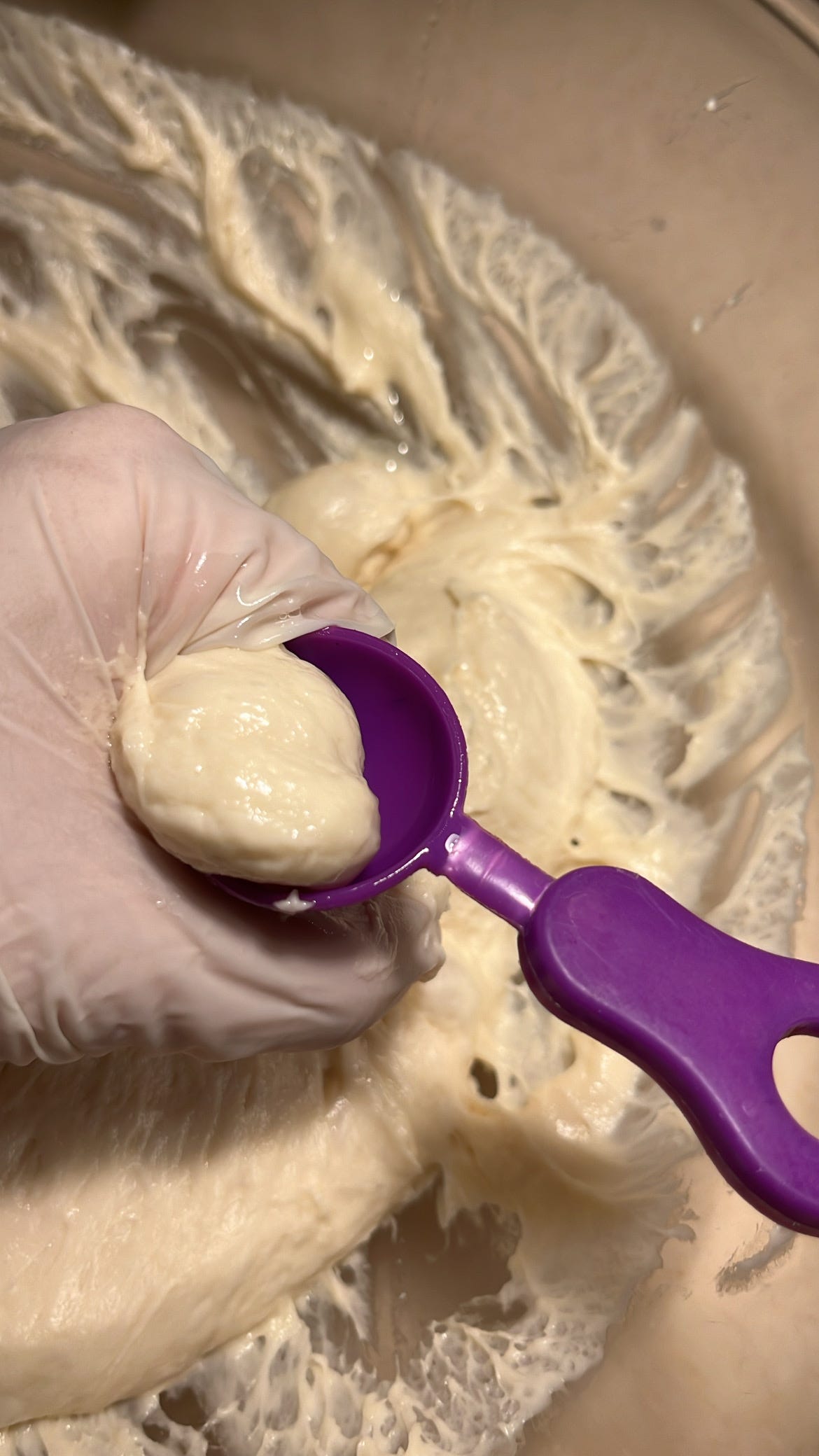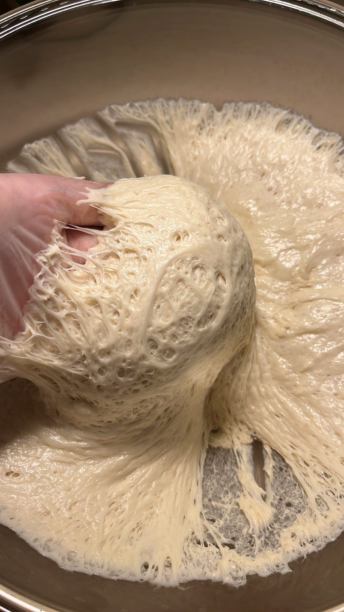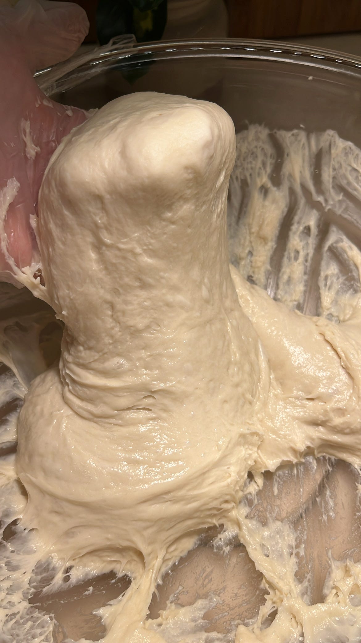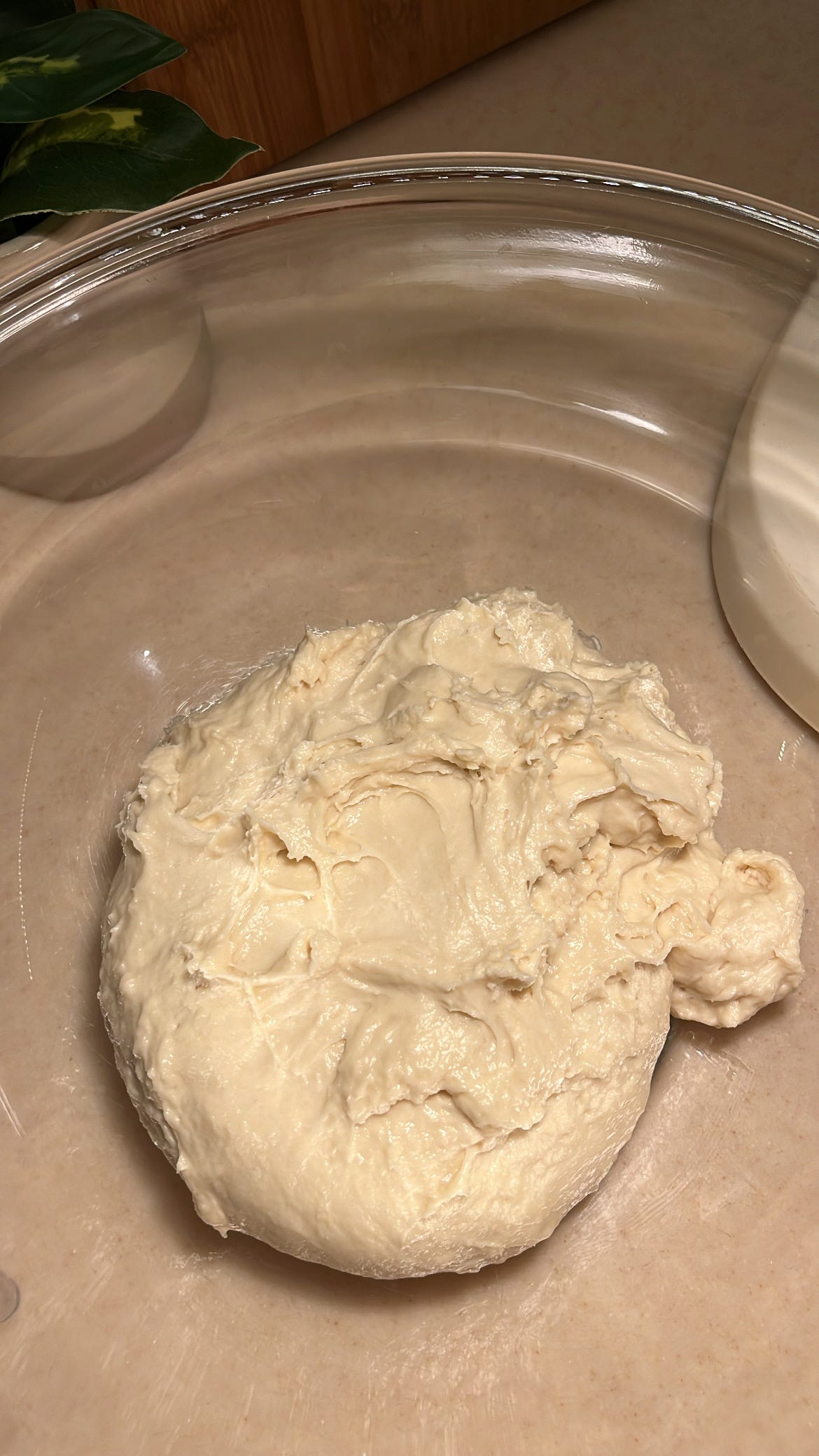 عند الحصول على قوام مثل الموضح في الصورة نتوقف عن العجن .