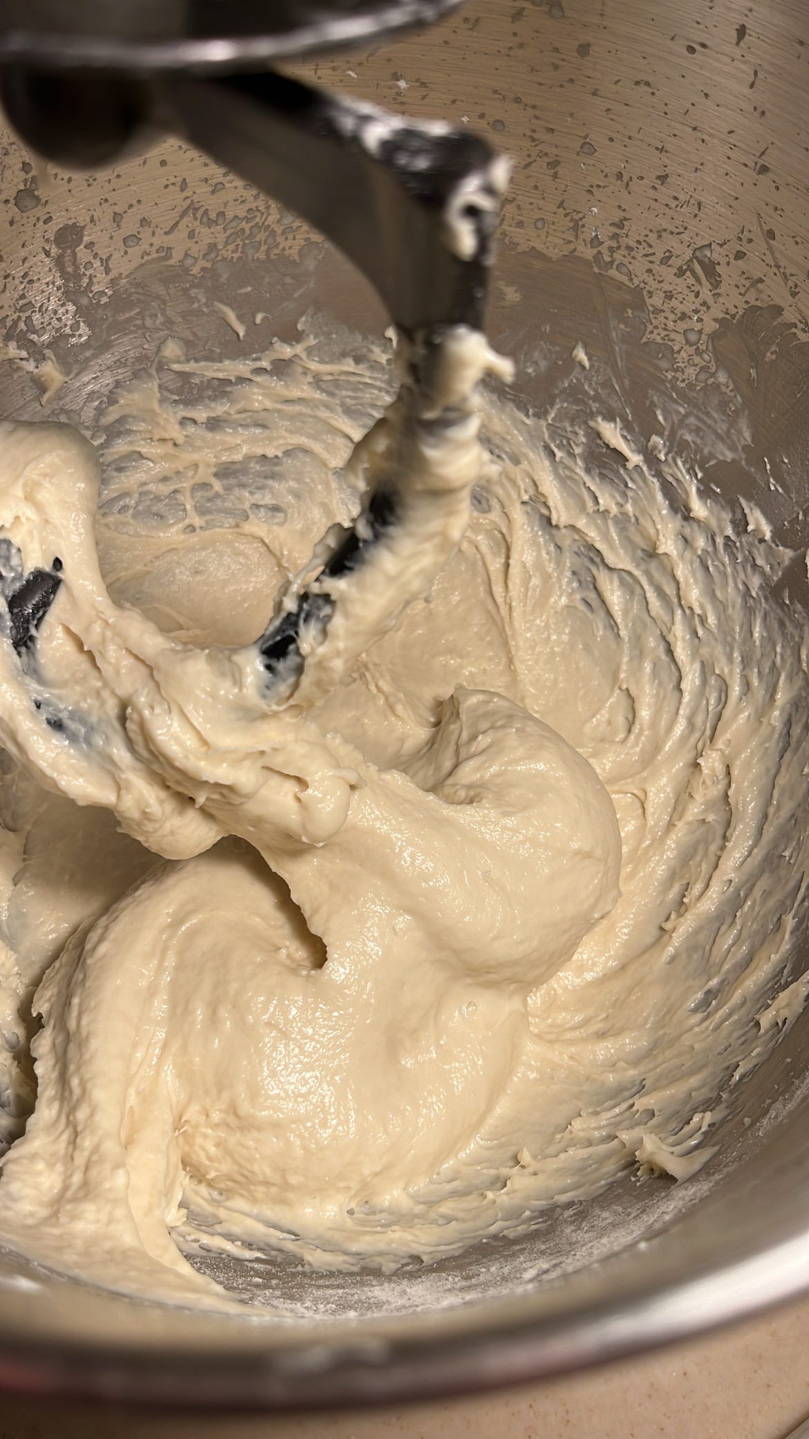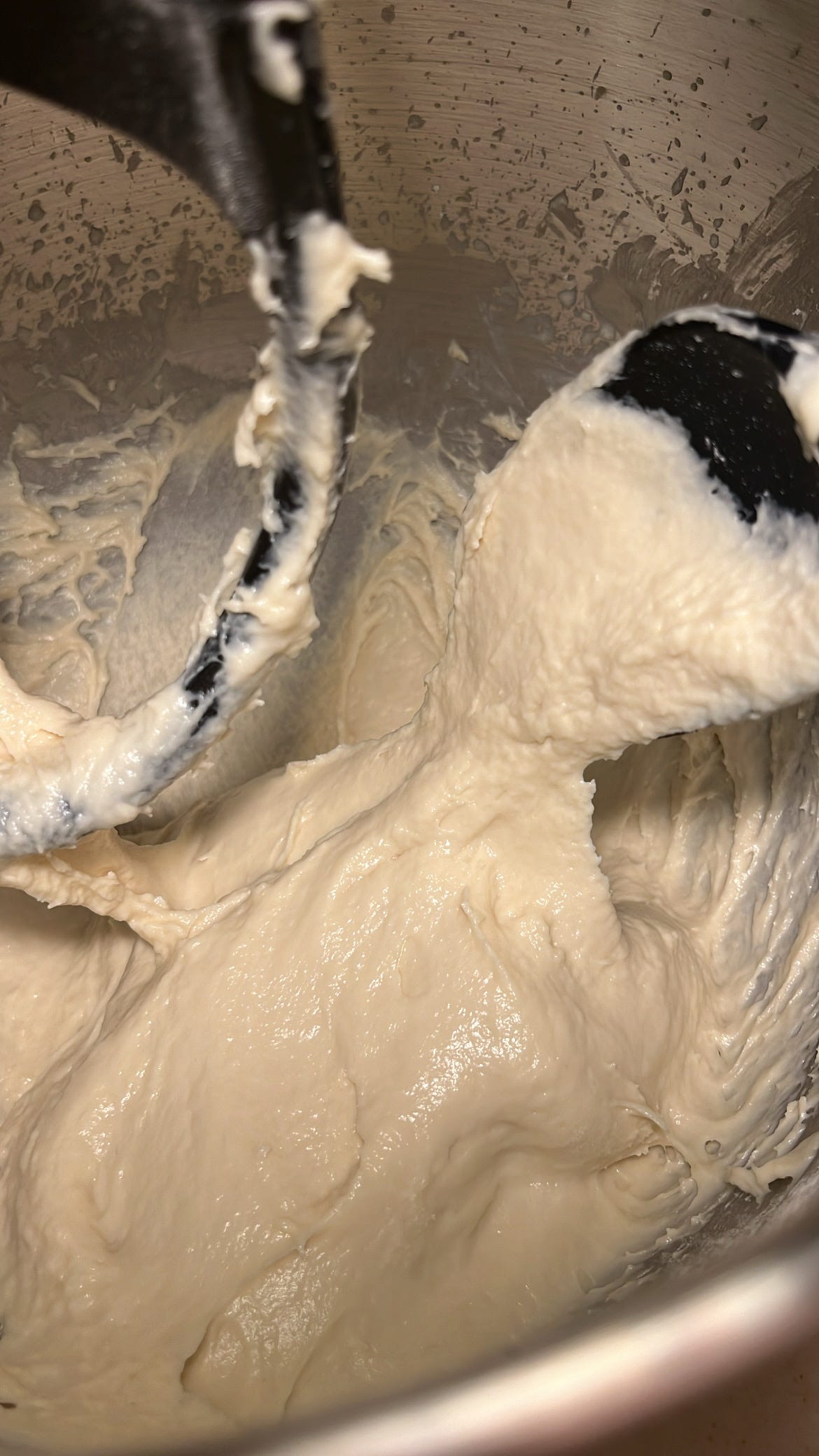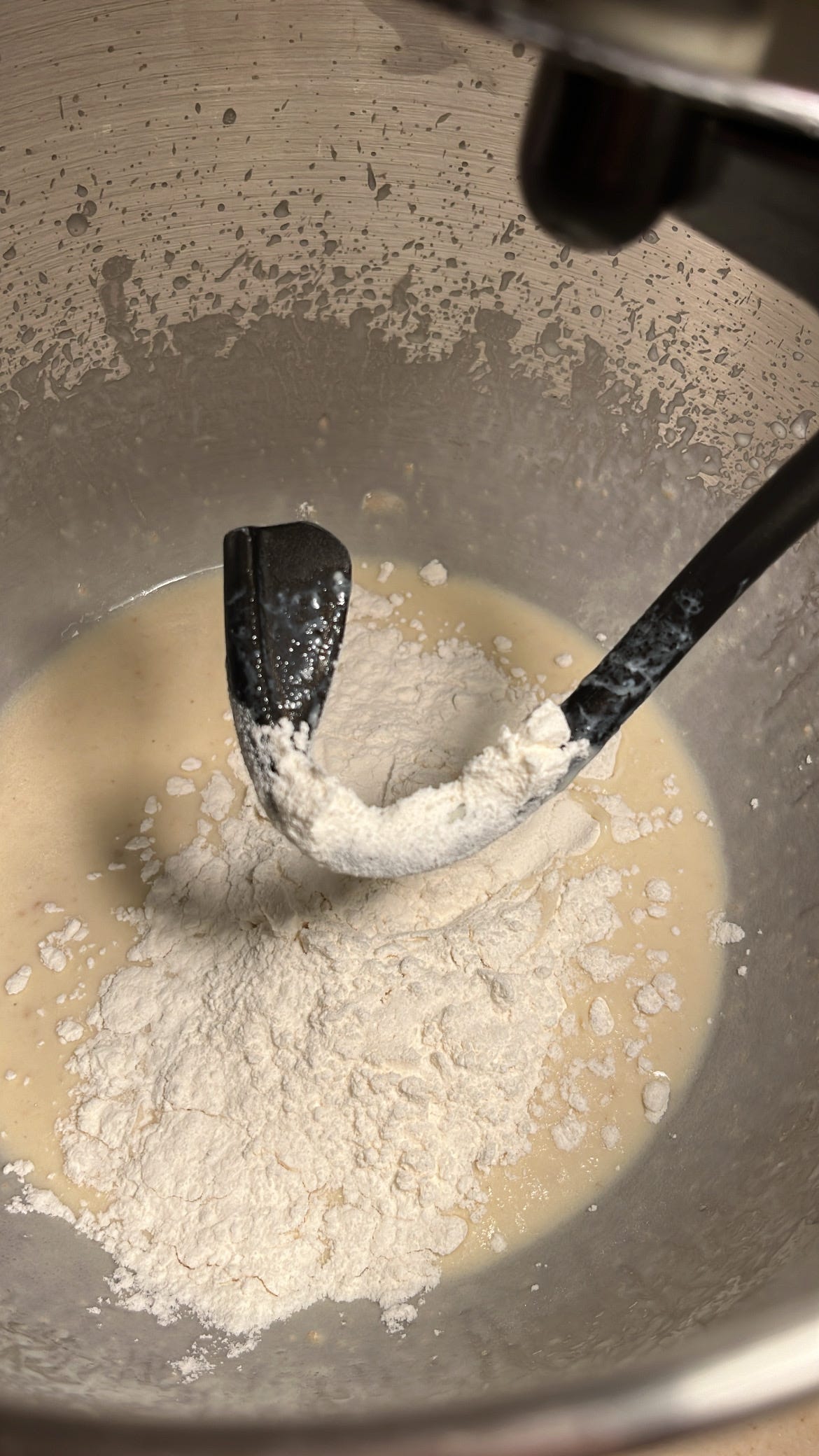 بعد التأكد من تجانس المكونات يتغير مضرب الخلط الى مضرب العجين