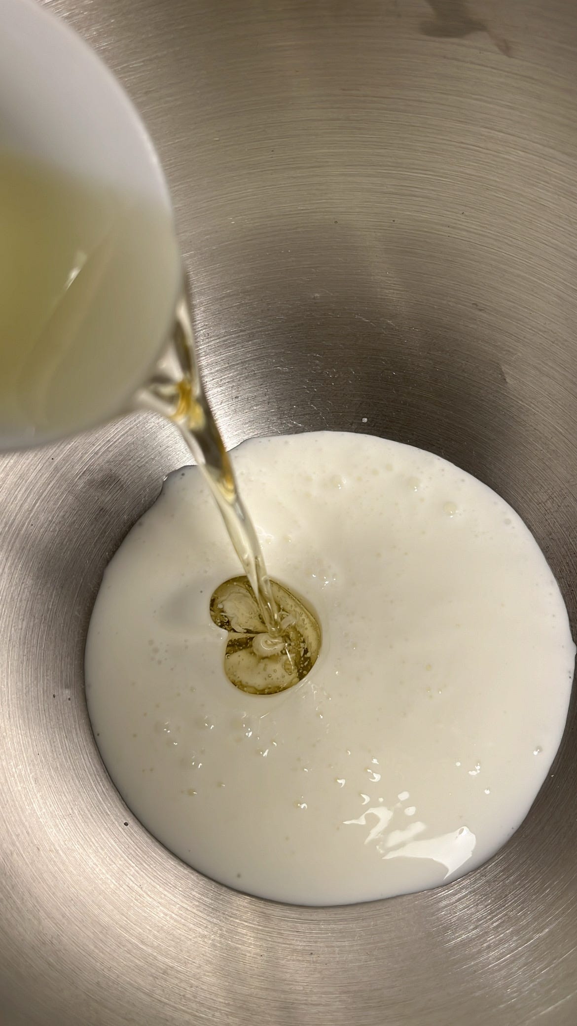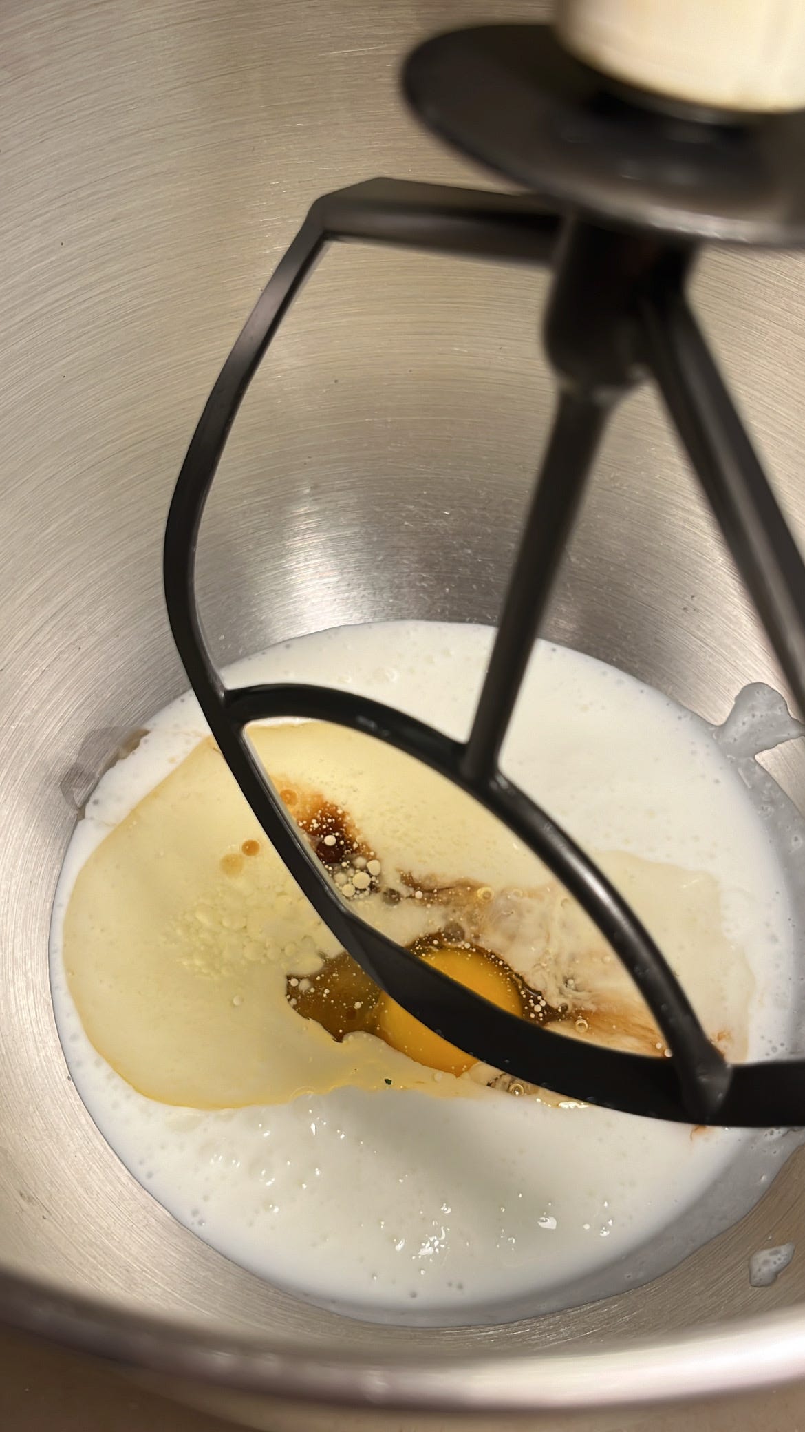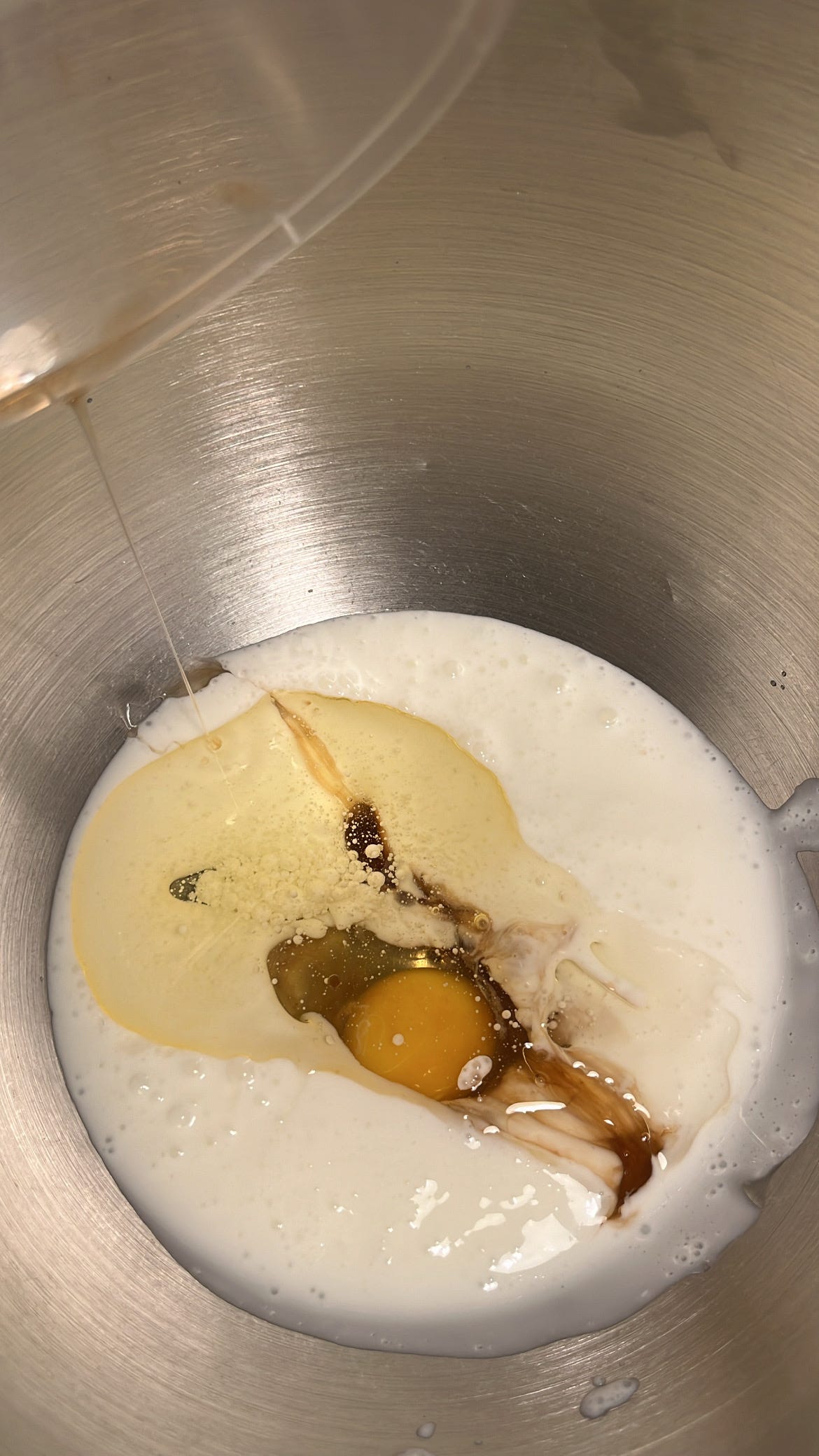 تضاف المقادير السائلة ( اللبن ، البيض والفانيليا ، الزيت )