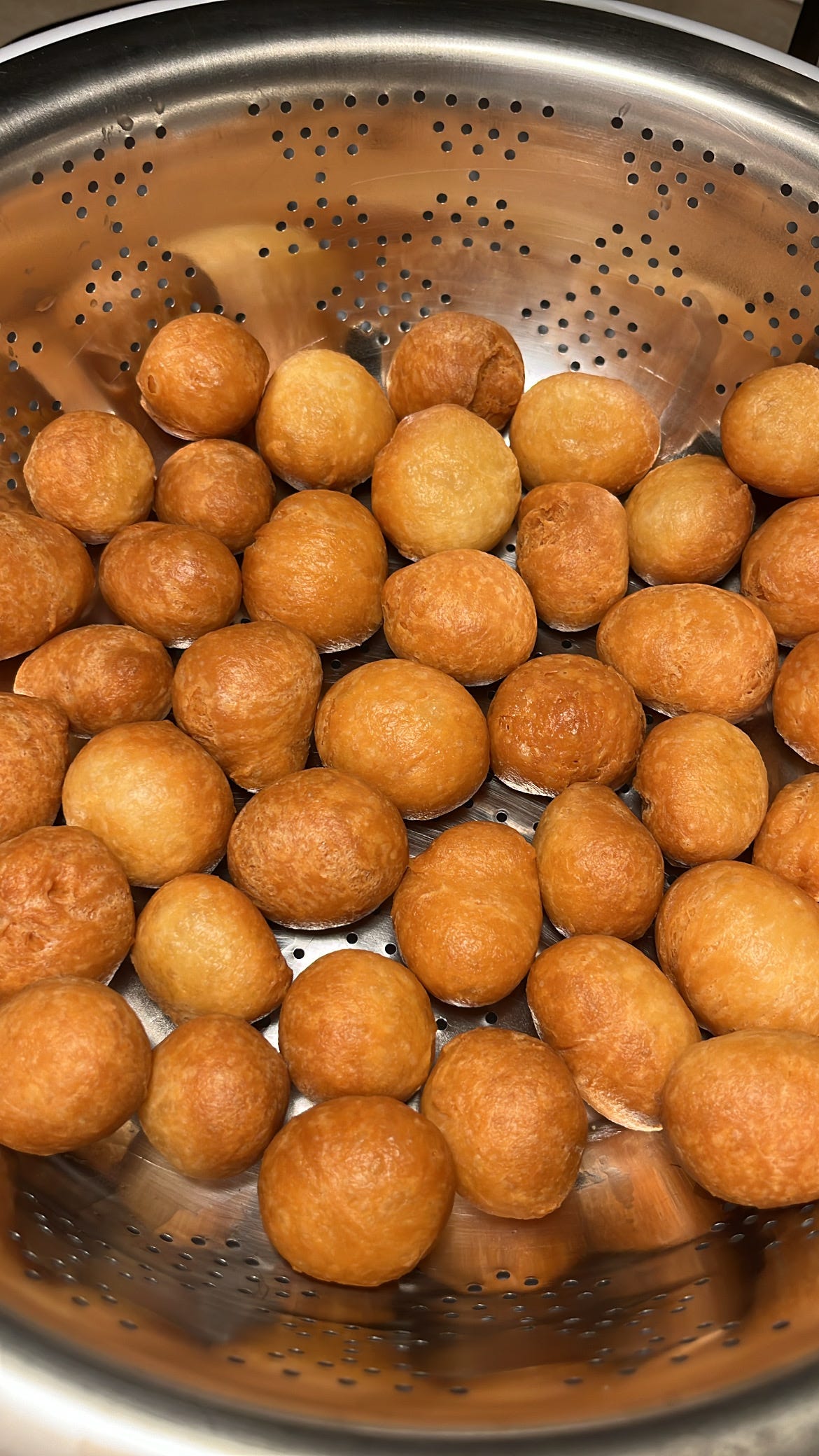 بعد ان تصل للون الذهبي المحبب تجمع وتوضع في مصفى للتخلص من اي زيوت زائدة