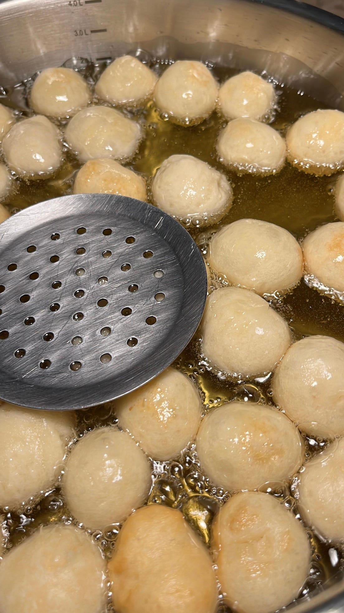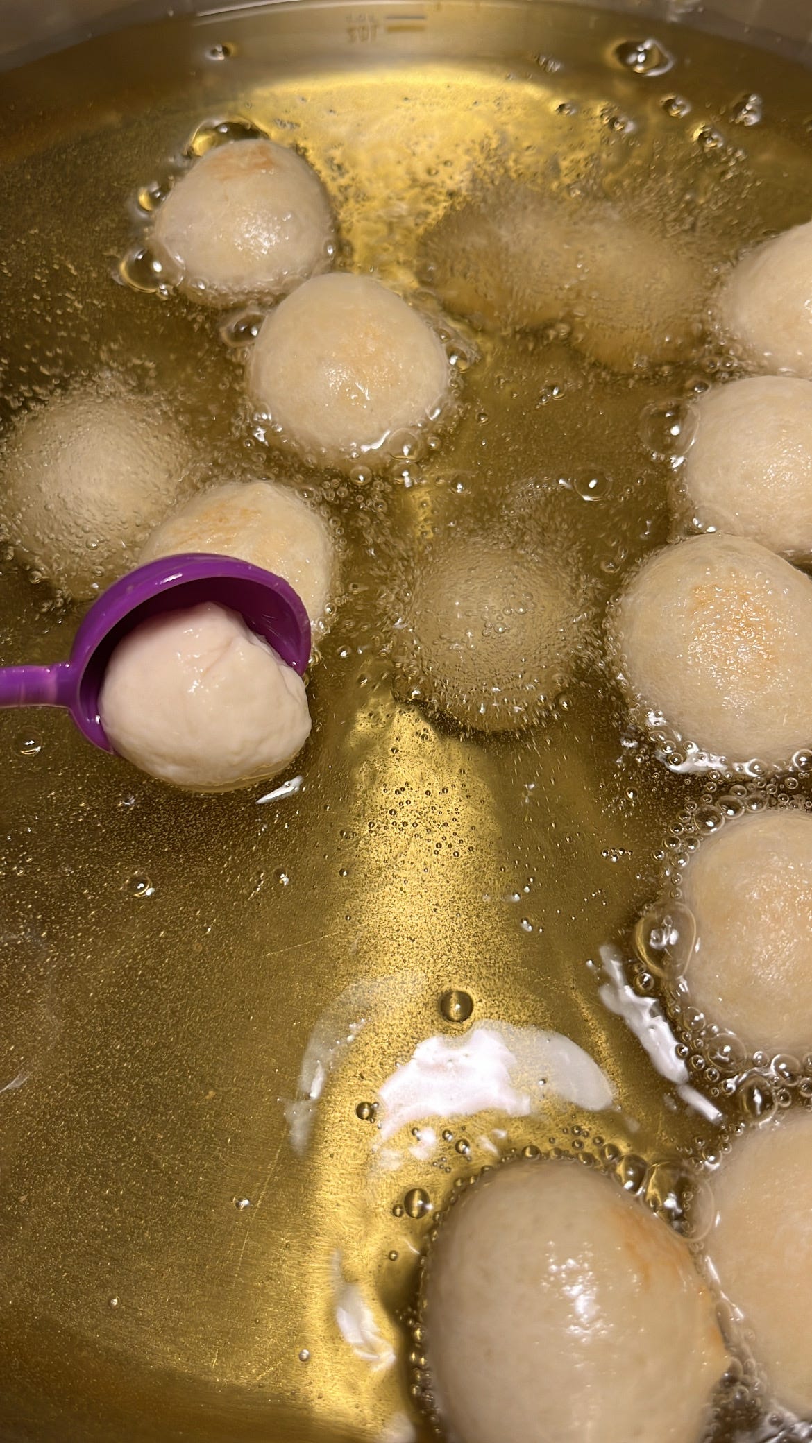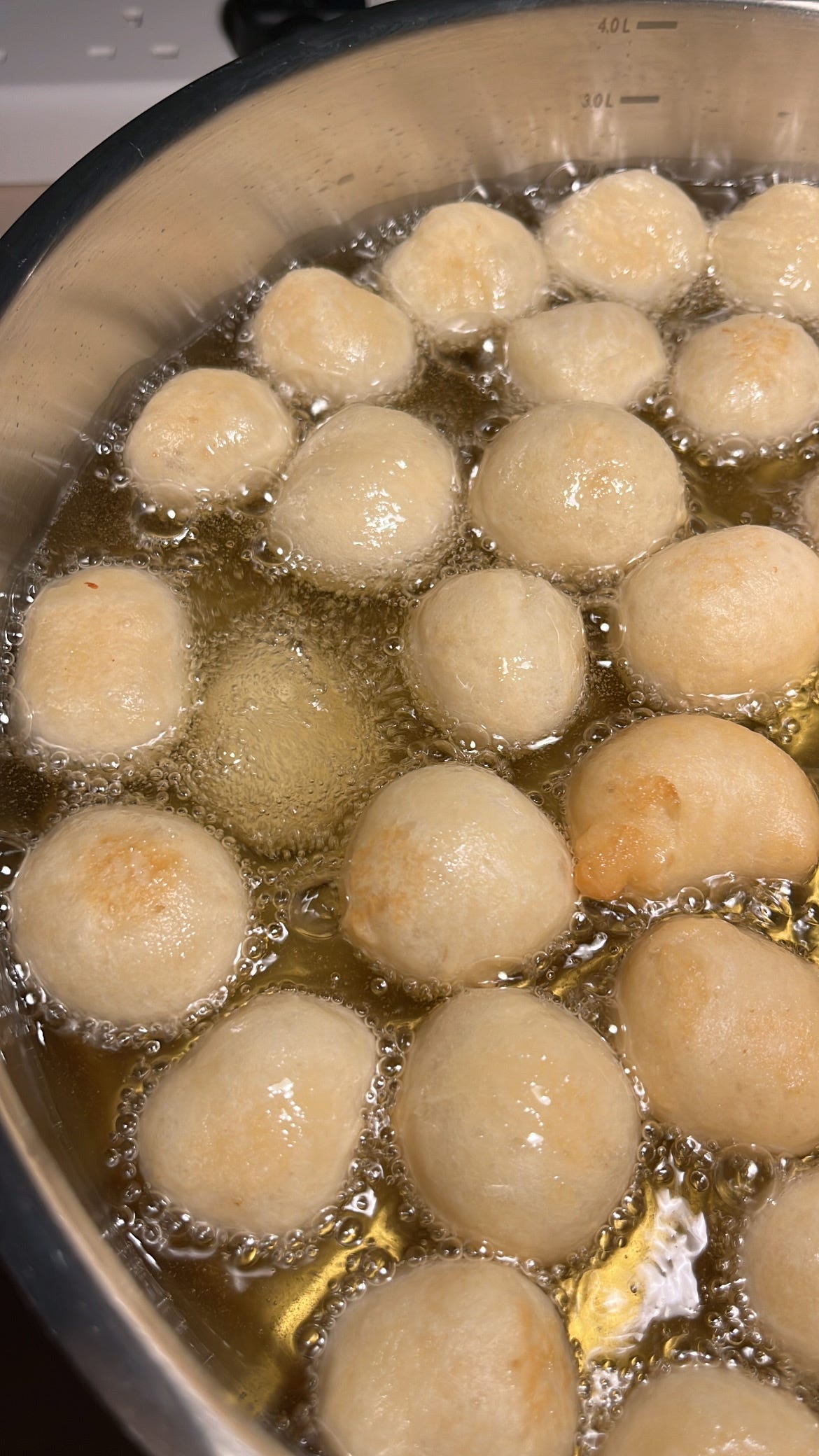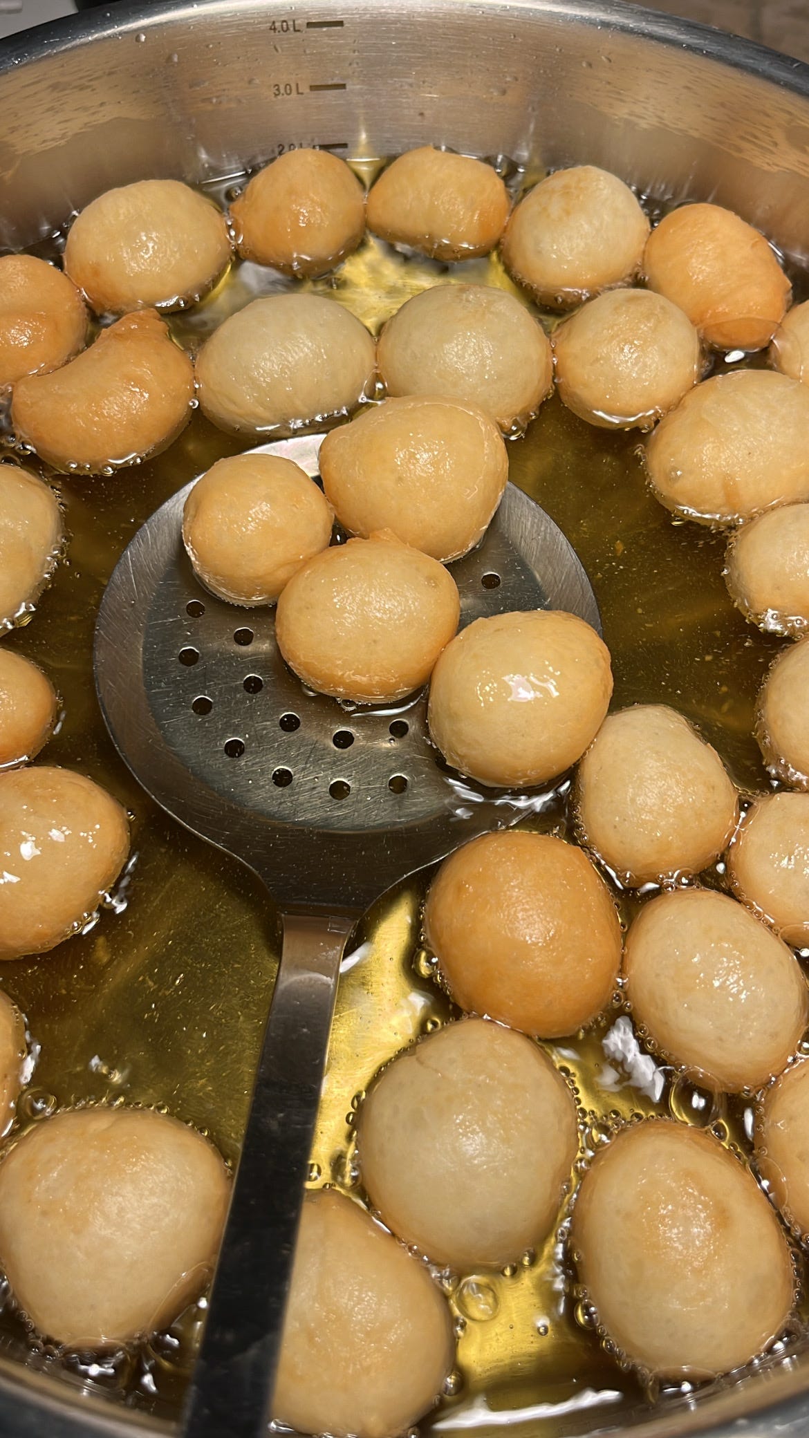 للقلي في قدر واسع تضاف كمية تملأ نصف الإناء ويسخن لدرجة متوسطة وتضاف قطعة من العجين لتأكد من سخونة الزيت .