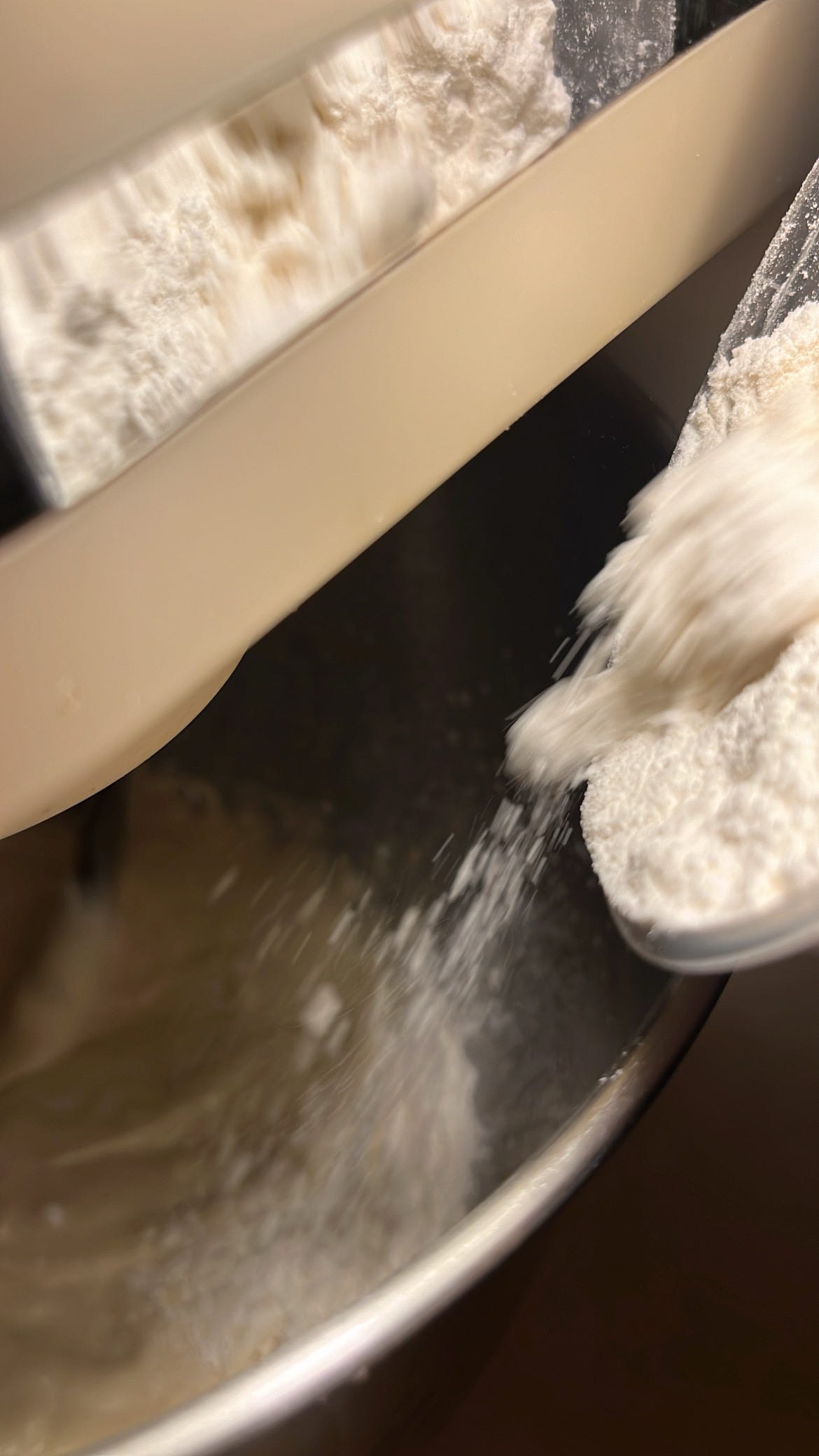 يضاف مقدار الدقيق بالتدريج مع استمرار العجن.